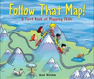 Follow That Map! A First Book of Mapping Skills by Scot Ritchie introduces children to many common features of maps as they follow the adventures of a group of children to find a missing dog.